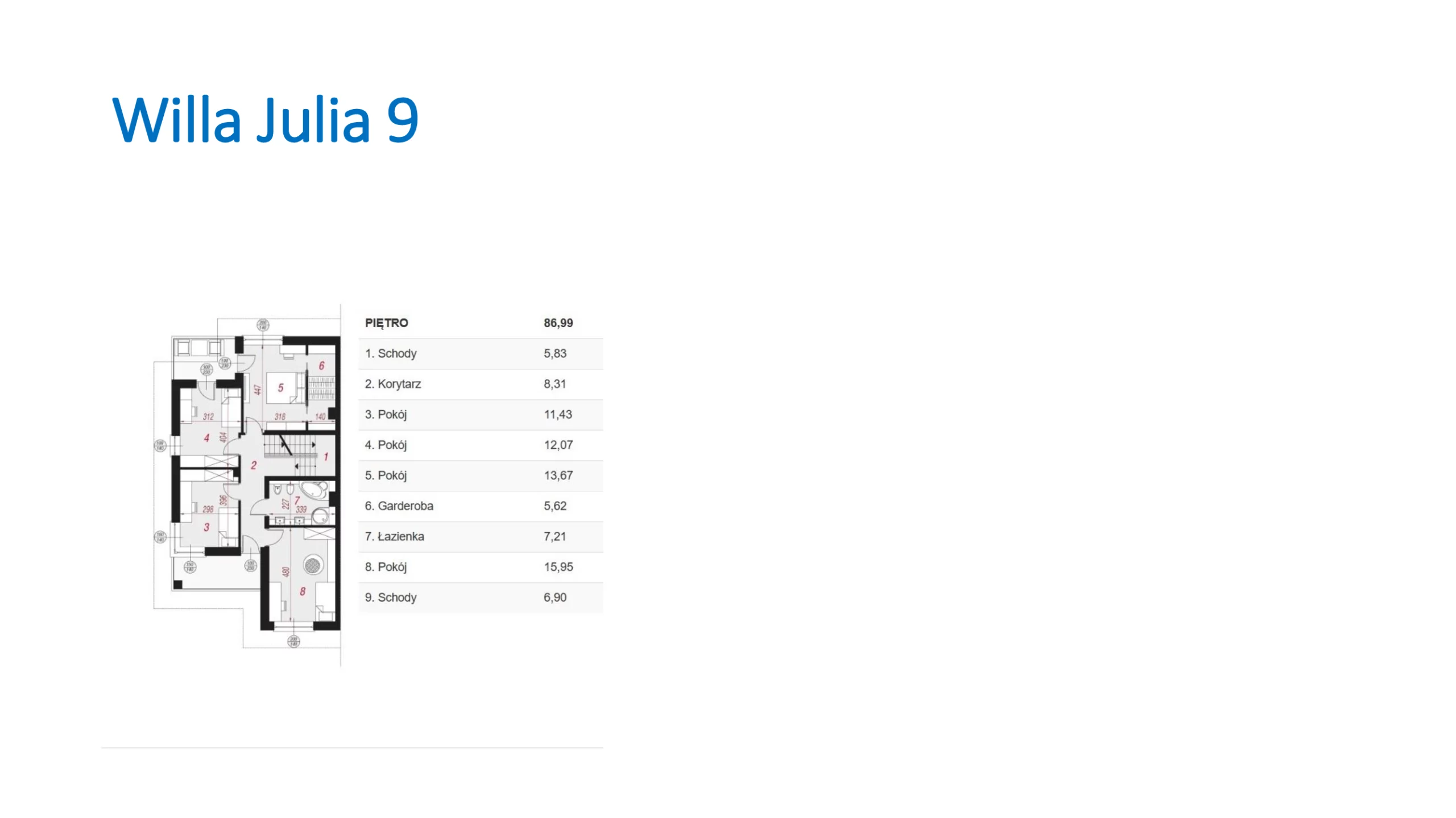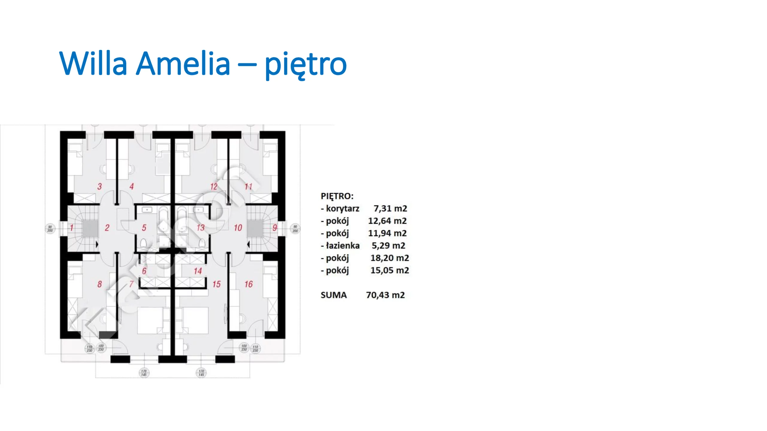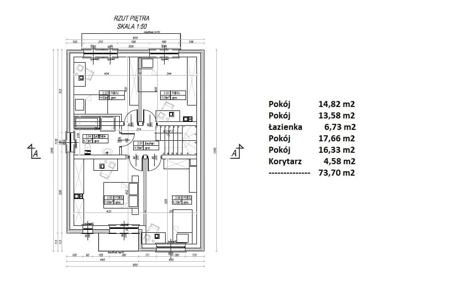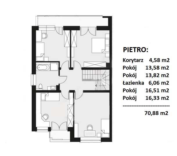 4 pokoje sypialniane (14,82 m2; 13,58 m2; 17,66 m2; 16,33 m2)
